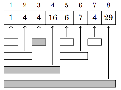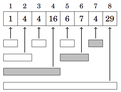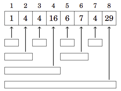 Usando uma BIT, qualquer valor de sum(1,i) pode ser calculado em tempo \(O(\log n)\), pois um intervalo \([1,i]\) sempre pode ser dividido em intervalos \(O(\log n)\) cujas somas são armazenadas na árvore. Por exemplo, o intervalo \([1,7]\) consiste nos seguintes intervalos: